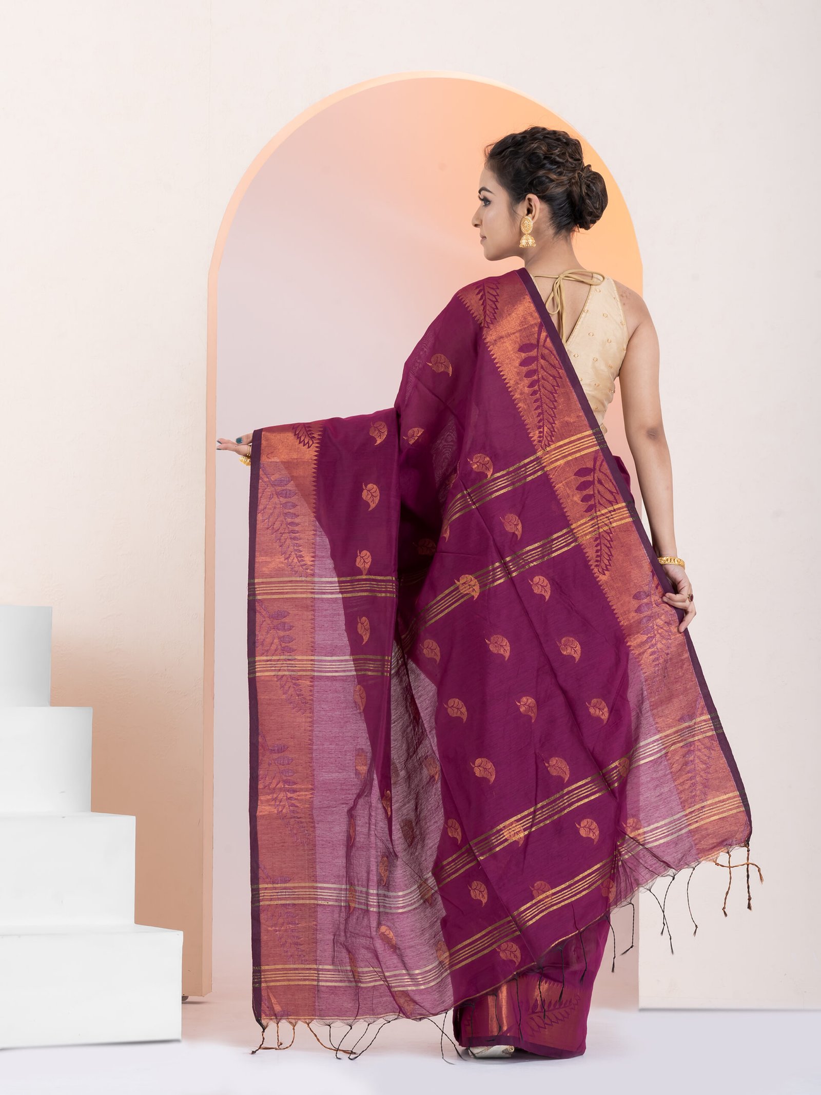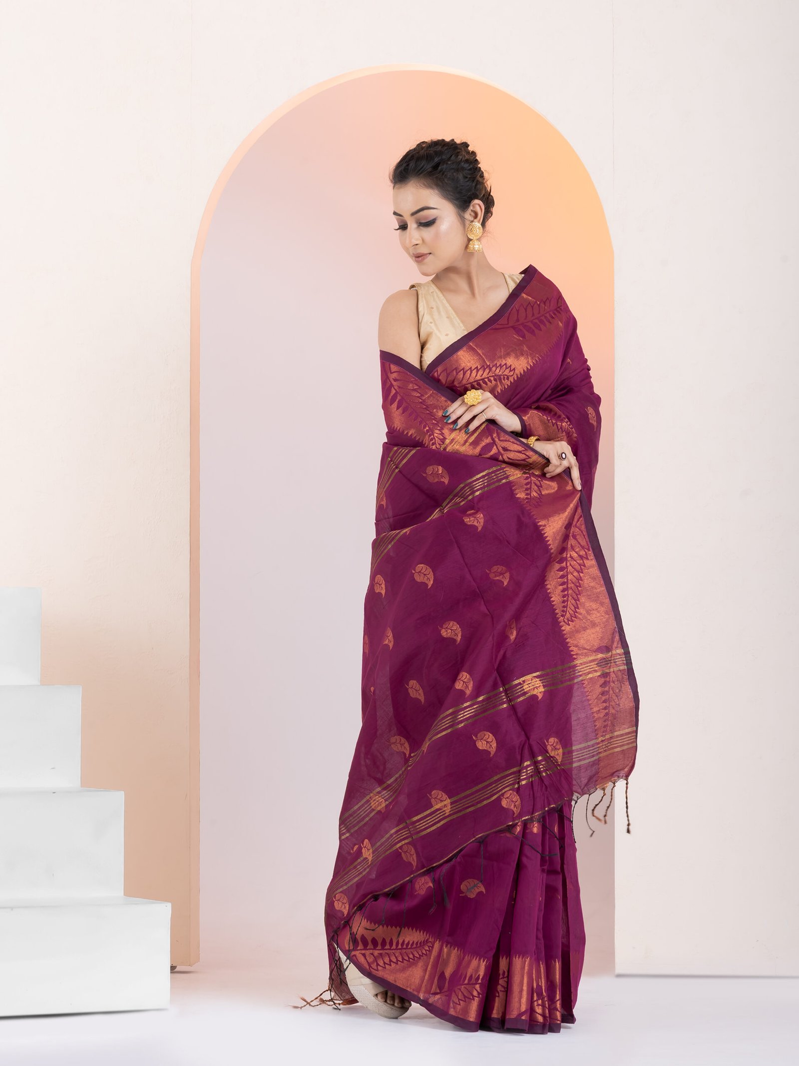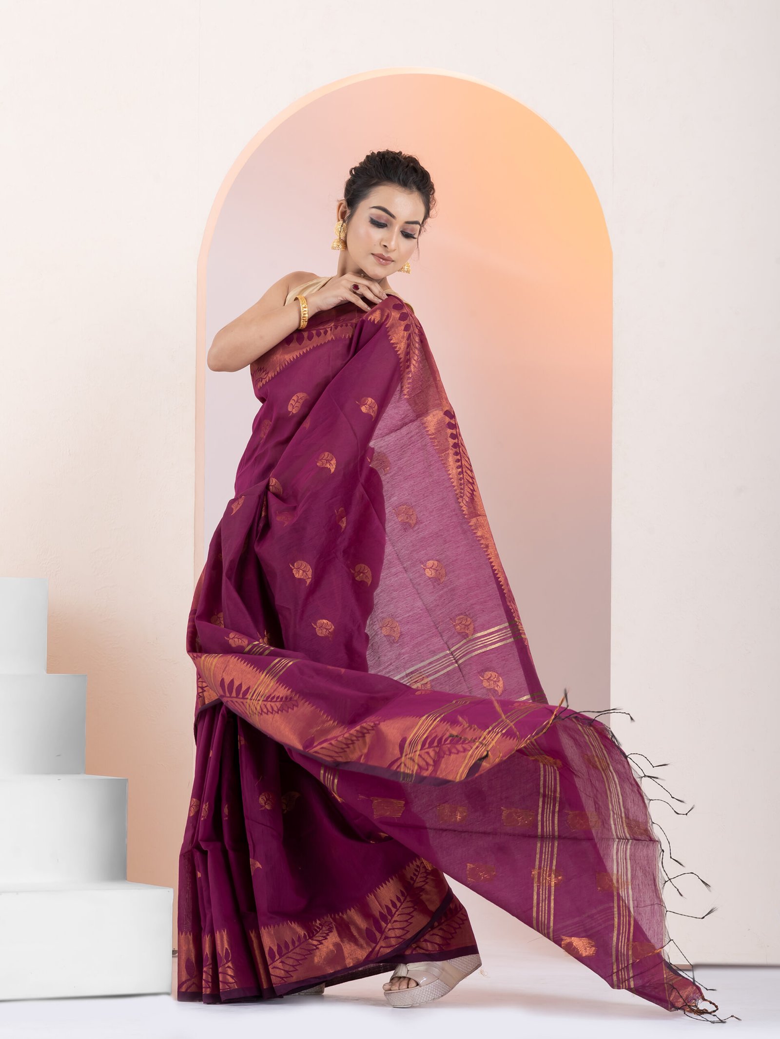 - Border: 2-side big copper zari border, enhancing the saree’s elegance